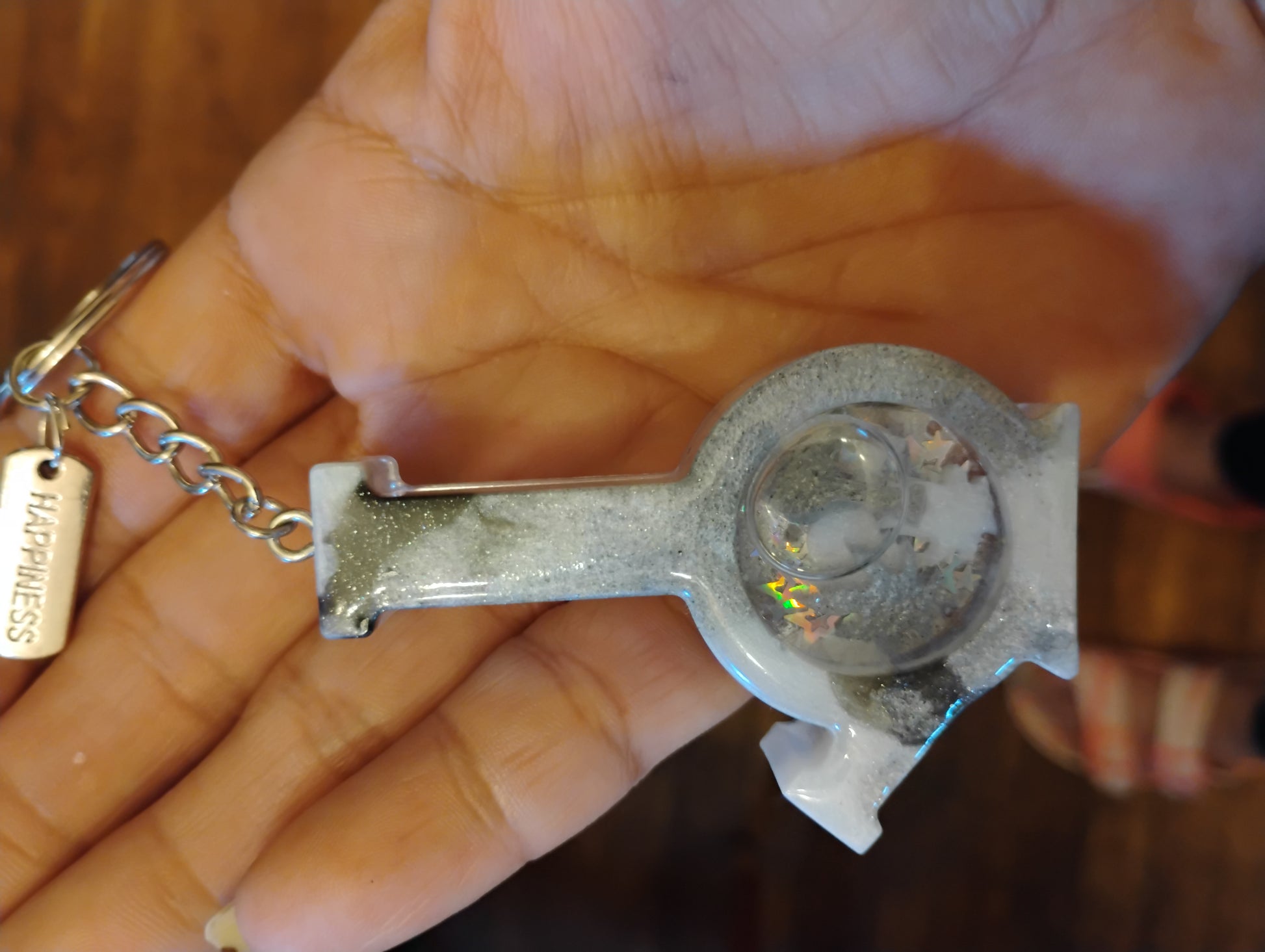 White, black and greyish color. Silver color accents with a tag that has happiness on it.