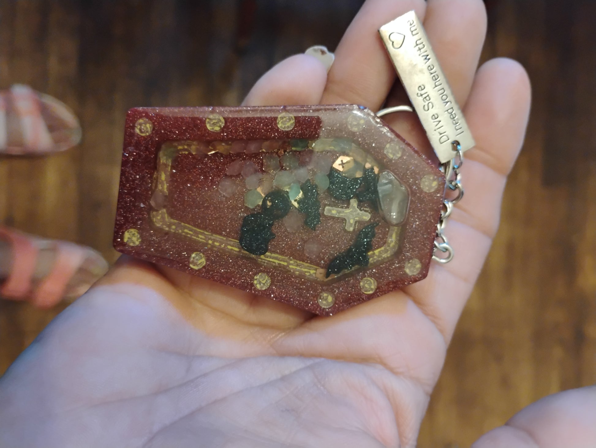 Coffin shaped shaker key chain red and gold. With silver accents and a tag printed on it Drive Safe I need you here with me and a heart