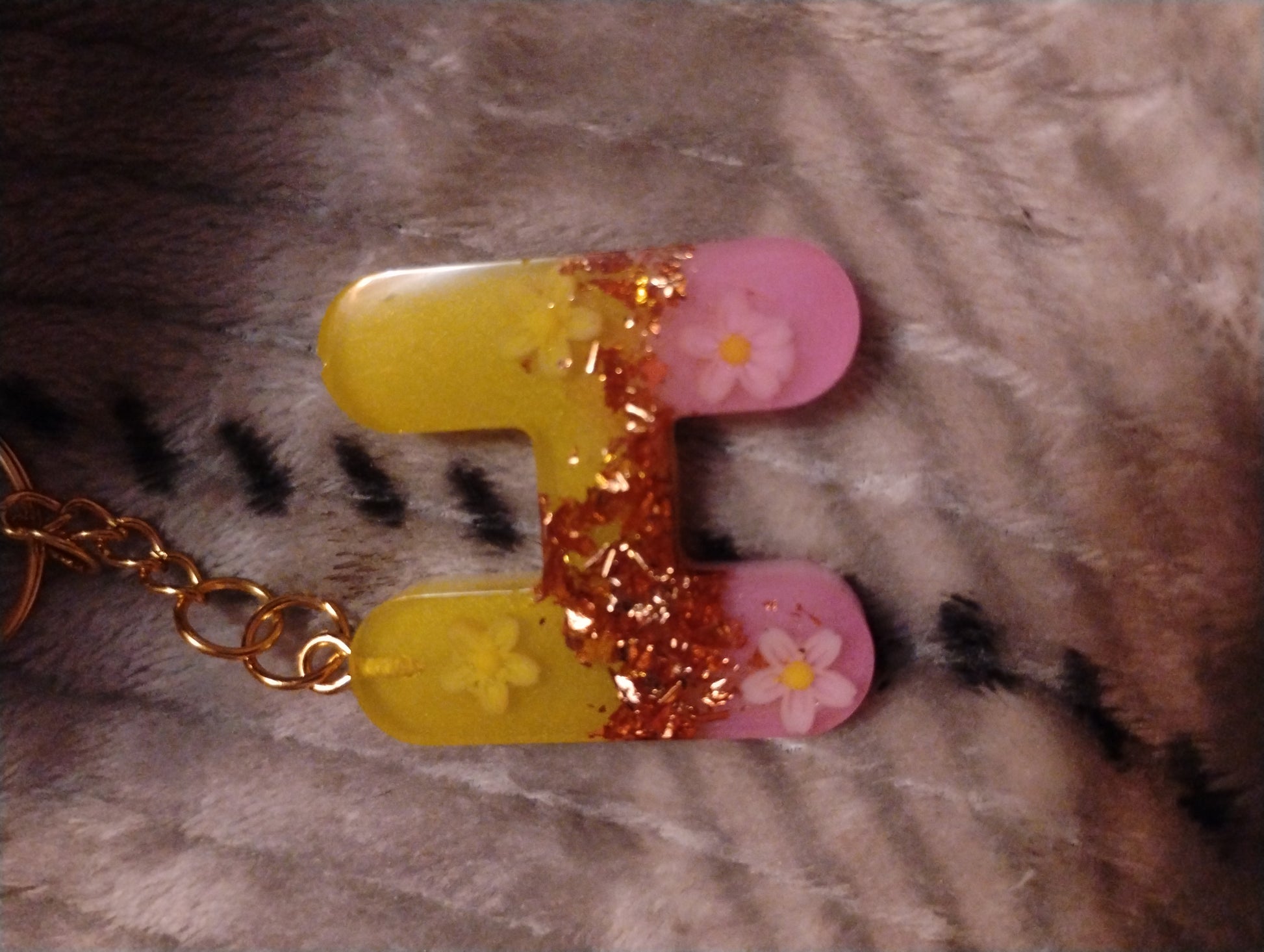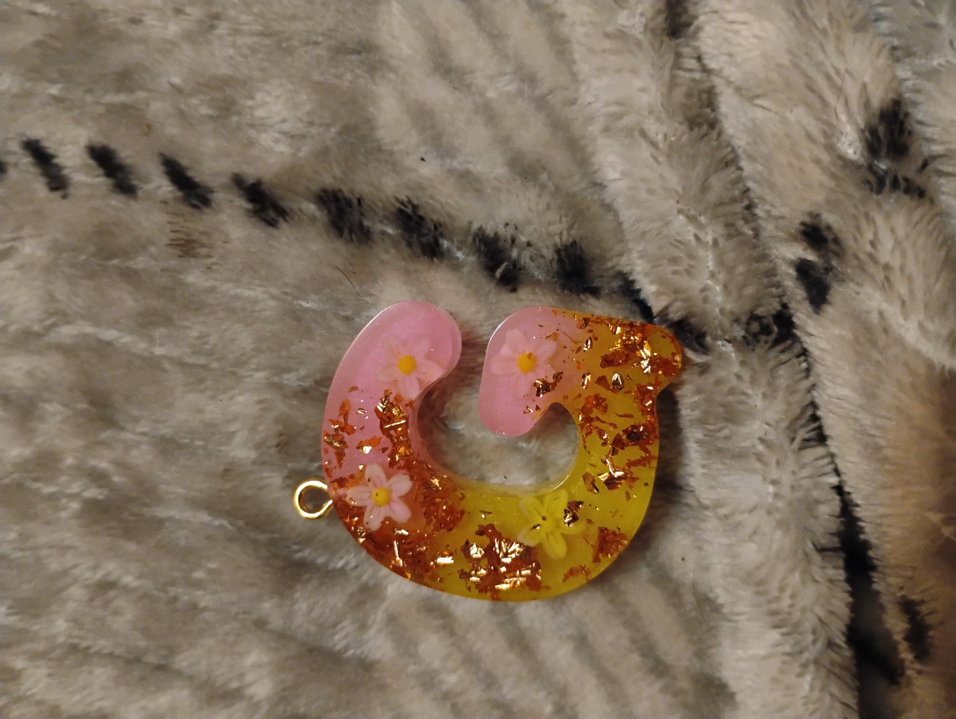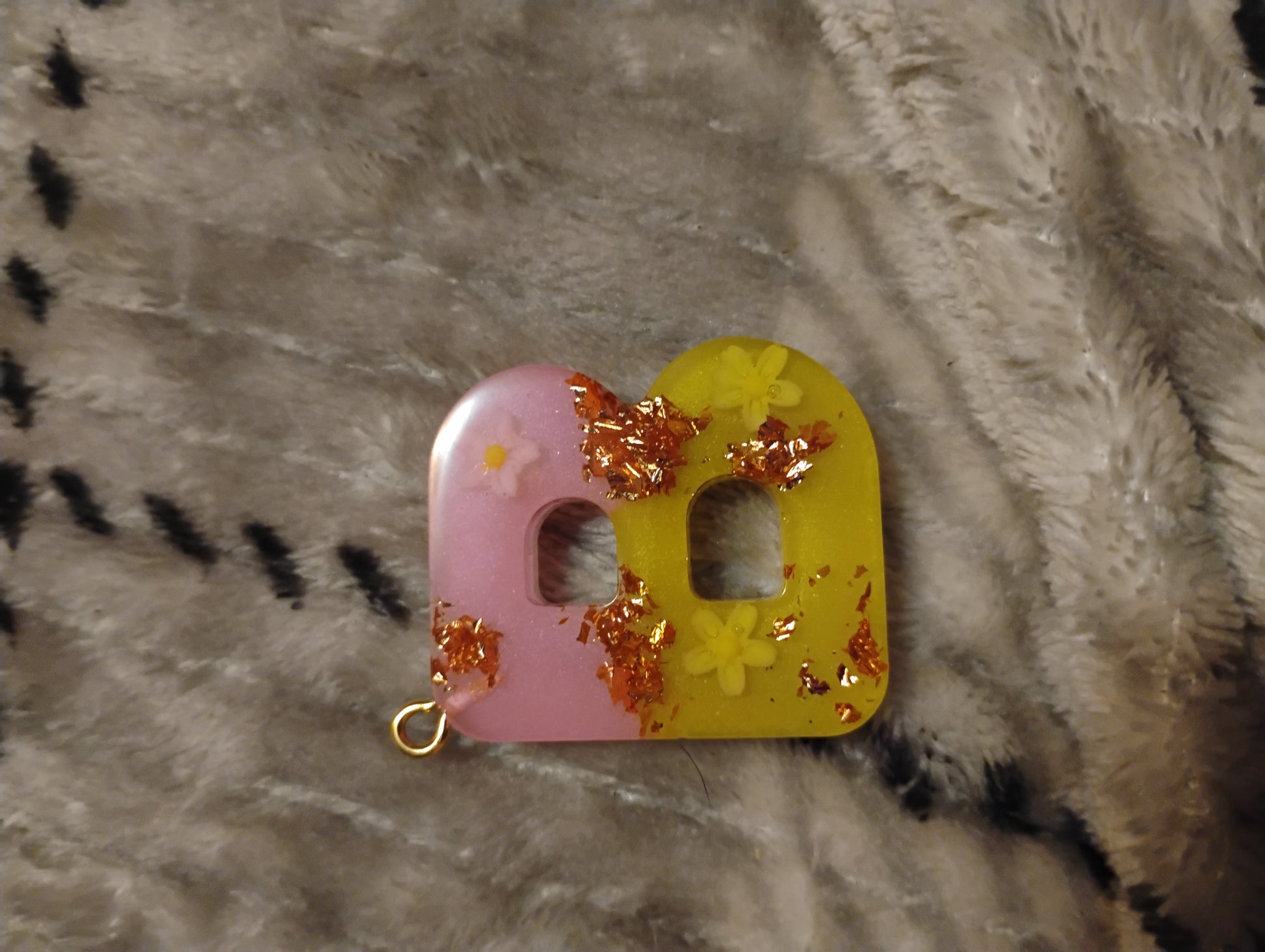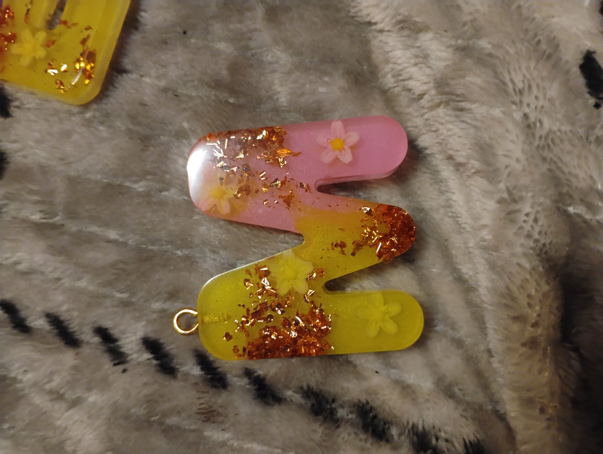 Pink yellow rose gold foil and flowers in them. With gold accent accessories. The letters B, H, G, and M. One each.